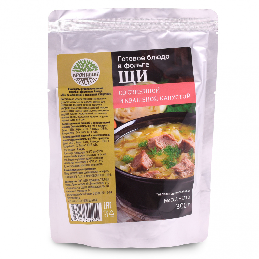 Готовое великолепное, ароматное, согревающее первое блюдо - Щи со свининой и квашеной капустой, легкое в приготовлении и удобное в транспортировке, может стать отличным дополнением к вашему рациону в походе или путешествии. Обработано высокой температурой, более 120°C, для сохранения витаминов и пищевой ценности.
