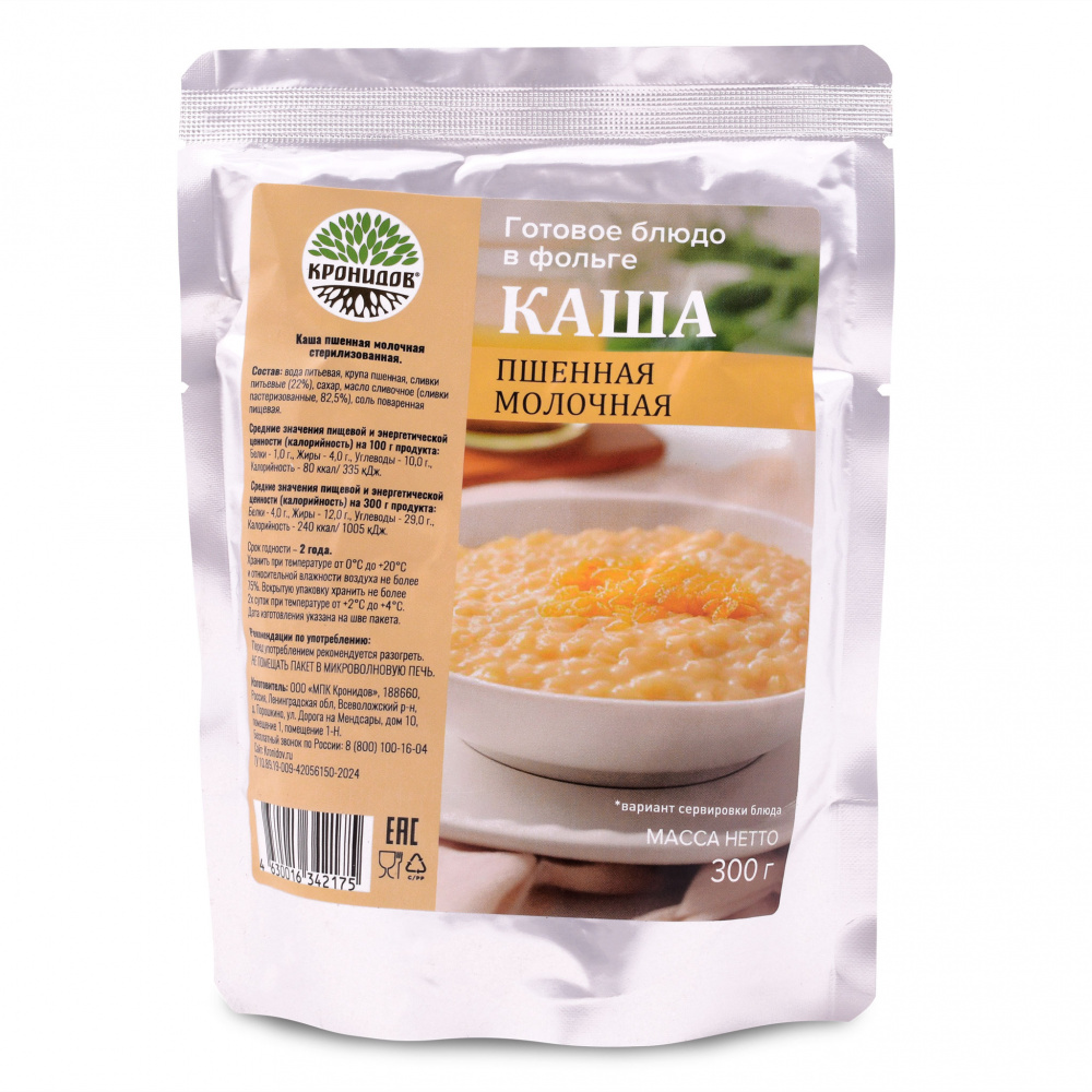 Каша молочная пшенная - традиционная сытная каша, приготовленная из пшенной крупы. Нежный вкус и густая консистенция. Вкусное блюдо на завтрак, легкое в приготовлении и удобное в транспортировке, станет отличным дополнением к вашему рациону в походе или путешествии. Обработано высокой температурой, более 120°C, для сохранения витаминов и пищевой ценности.
