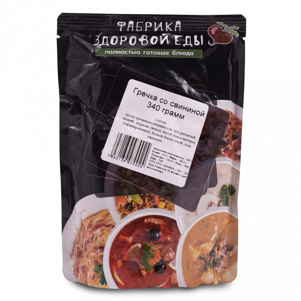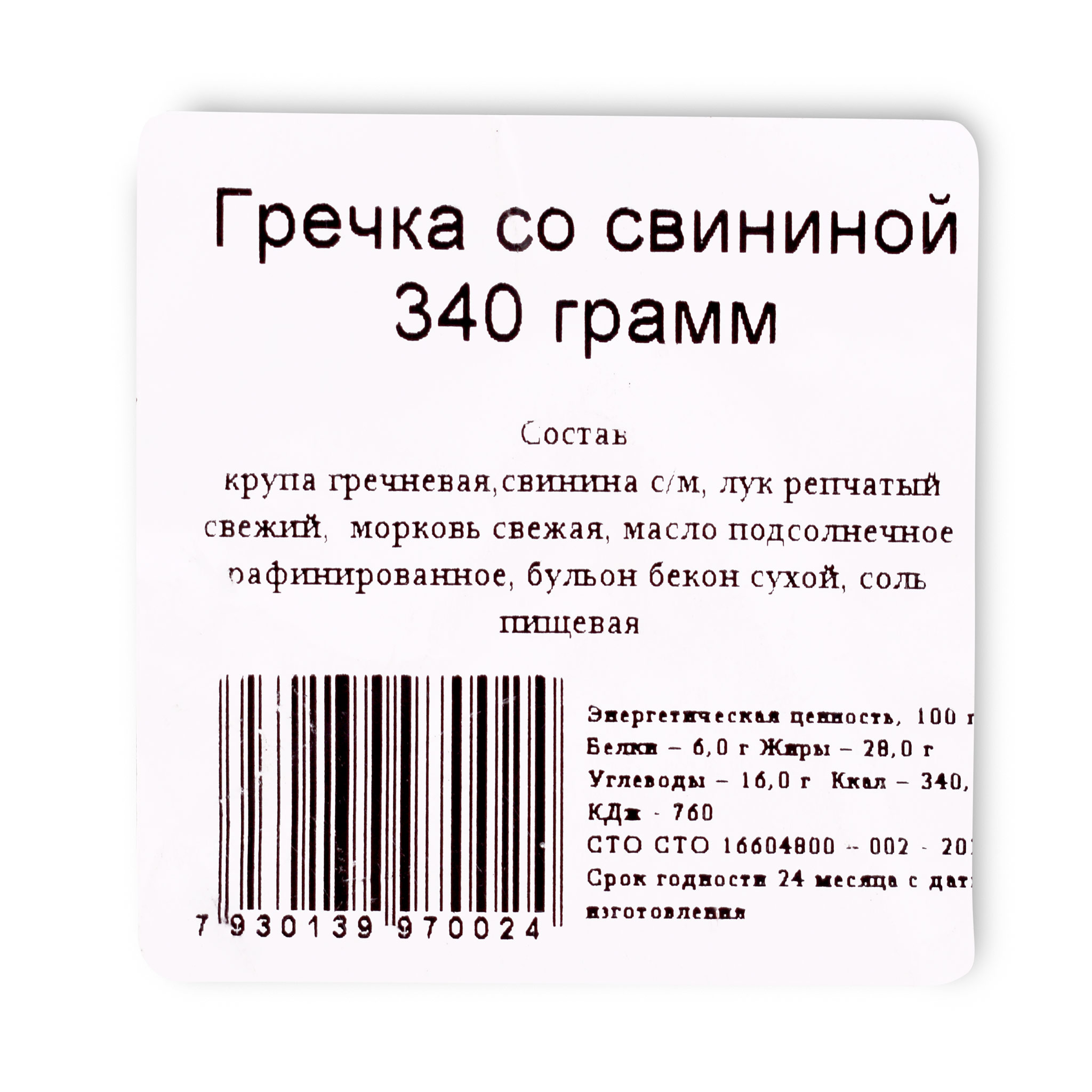 Состав: крупа гречневая, свинина с/м, лук репчатый свежий, морковь свежая, масло подсолнечное рафинированное, бульон бекон сухой, соль.