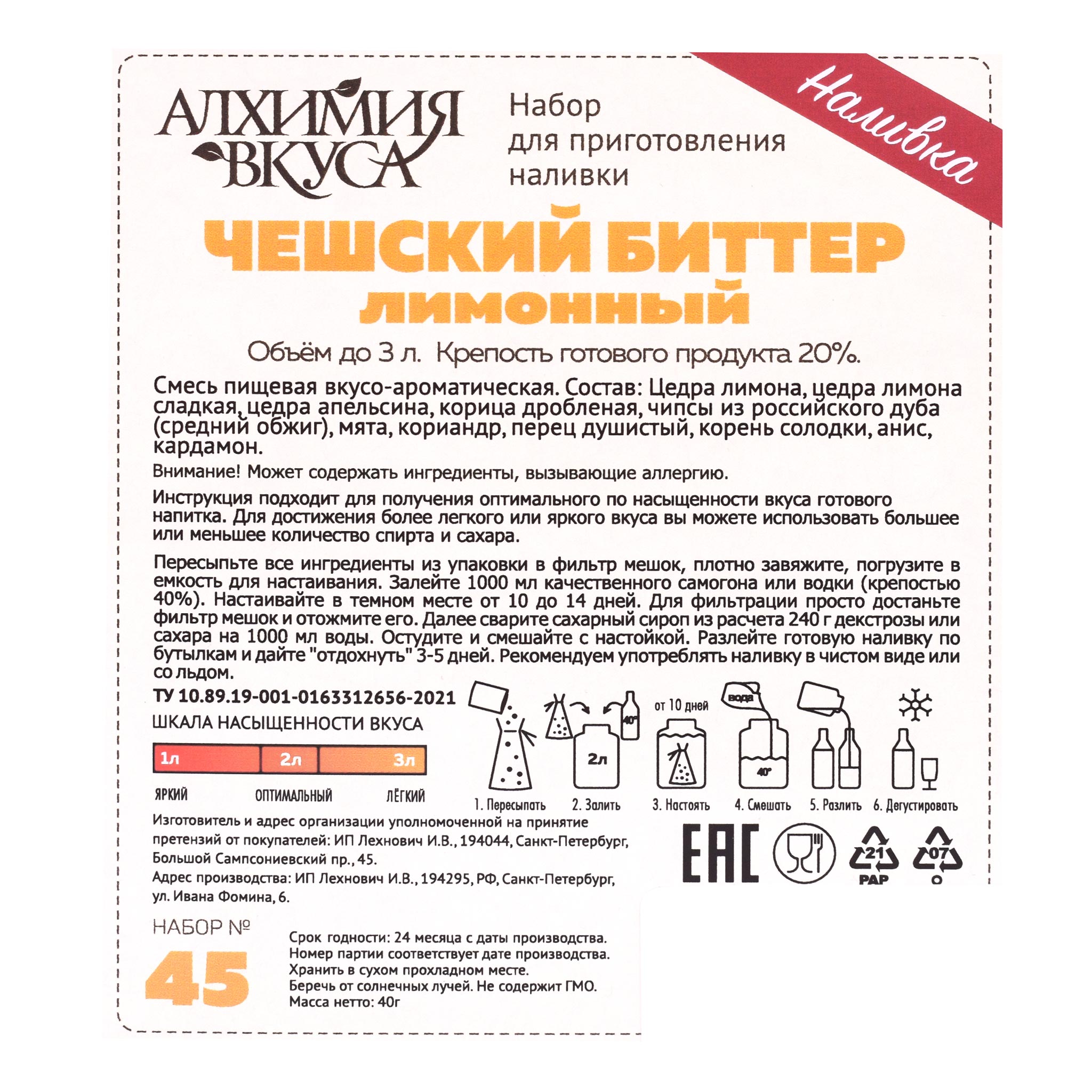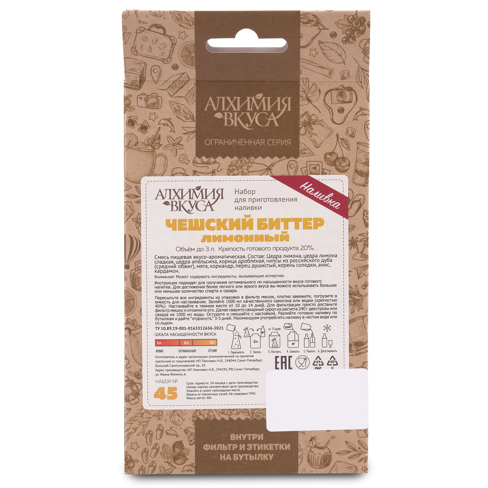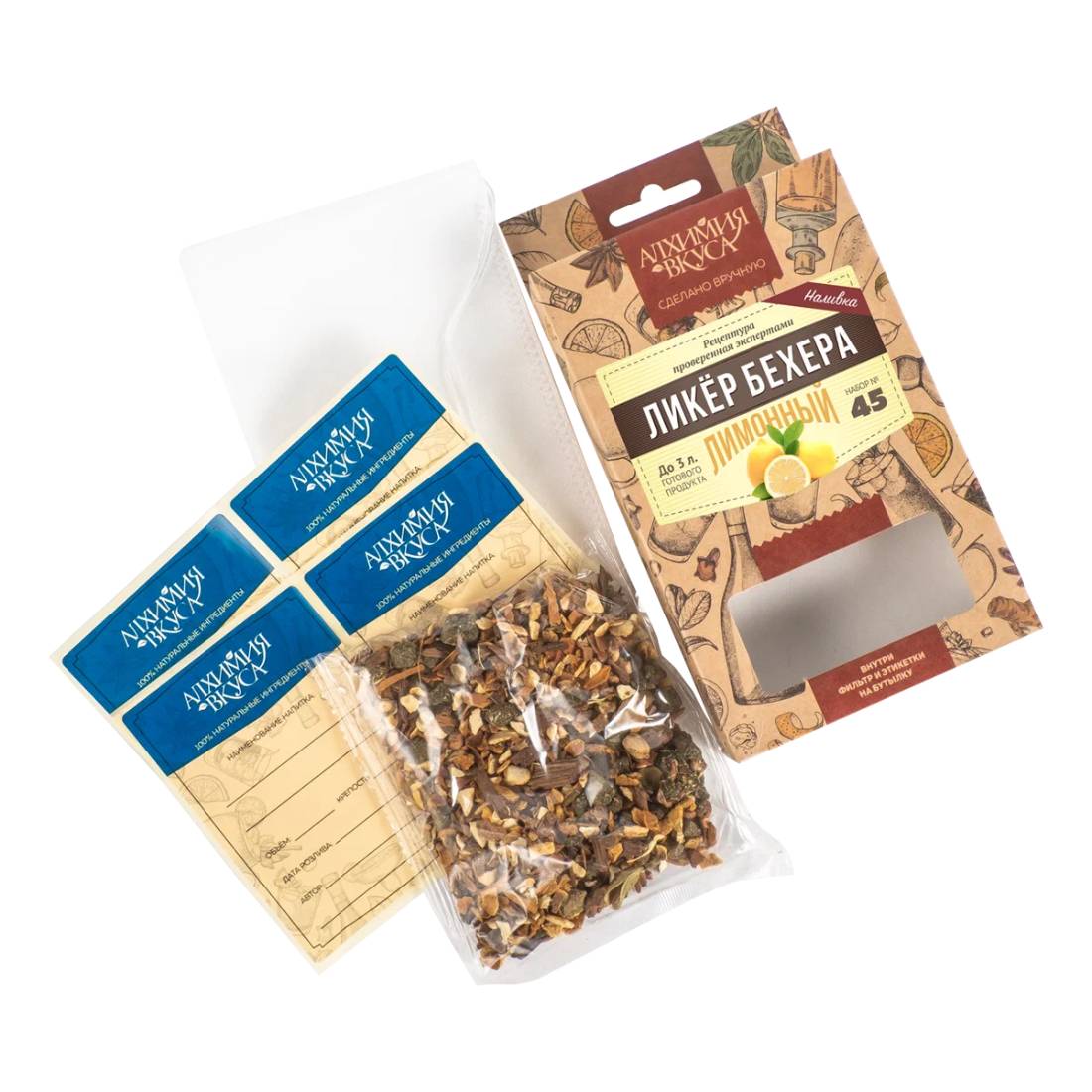 - В каждом наборе Алхимия вкуса находится специальный фильтр мешок, который позволяет не фильтровать готовый продукт после настаивания, а также этикетки для бутылок с готовым напитком.