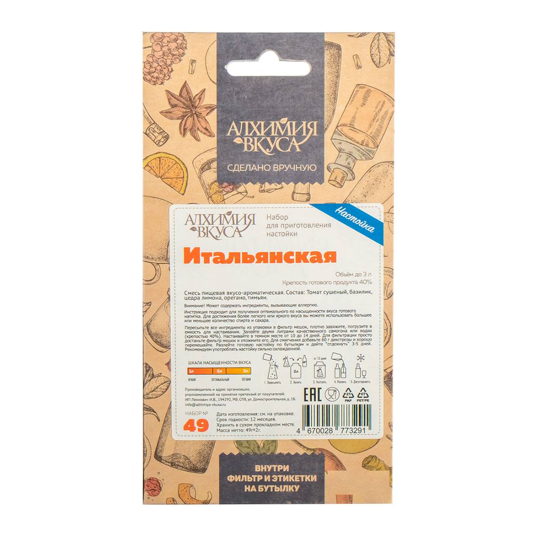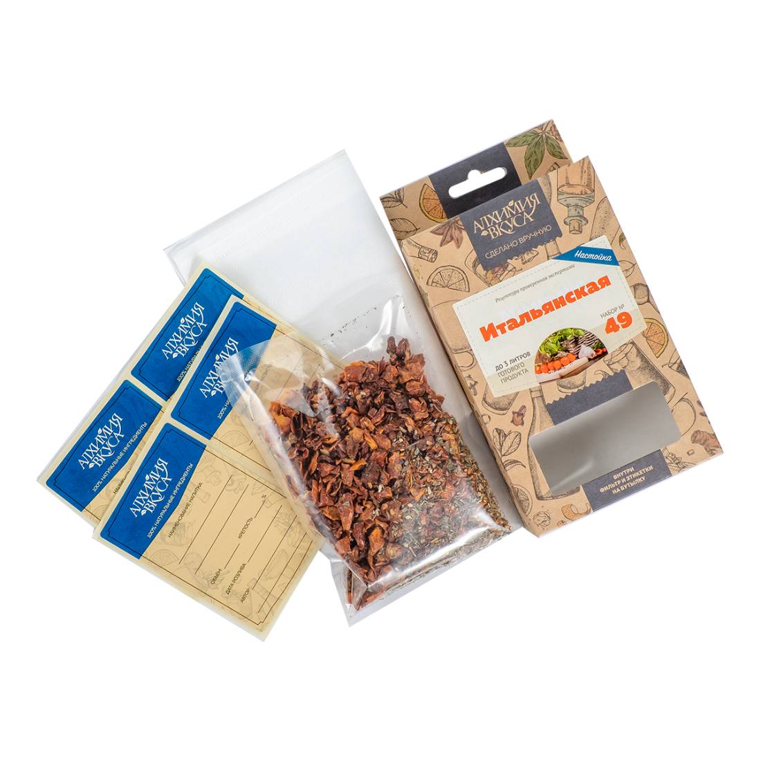 - В каждом наборе Алхимия вкуса находится специальный фильтр мешок, который позволяет не фильтровать готовый продукт после настаивания, а также этикетки для бутылок с готовым напитком.