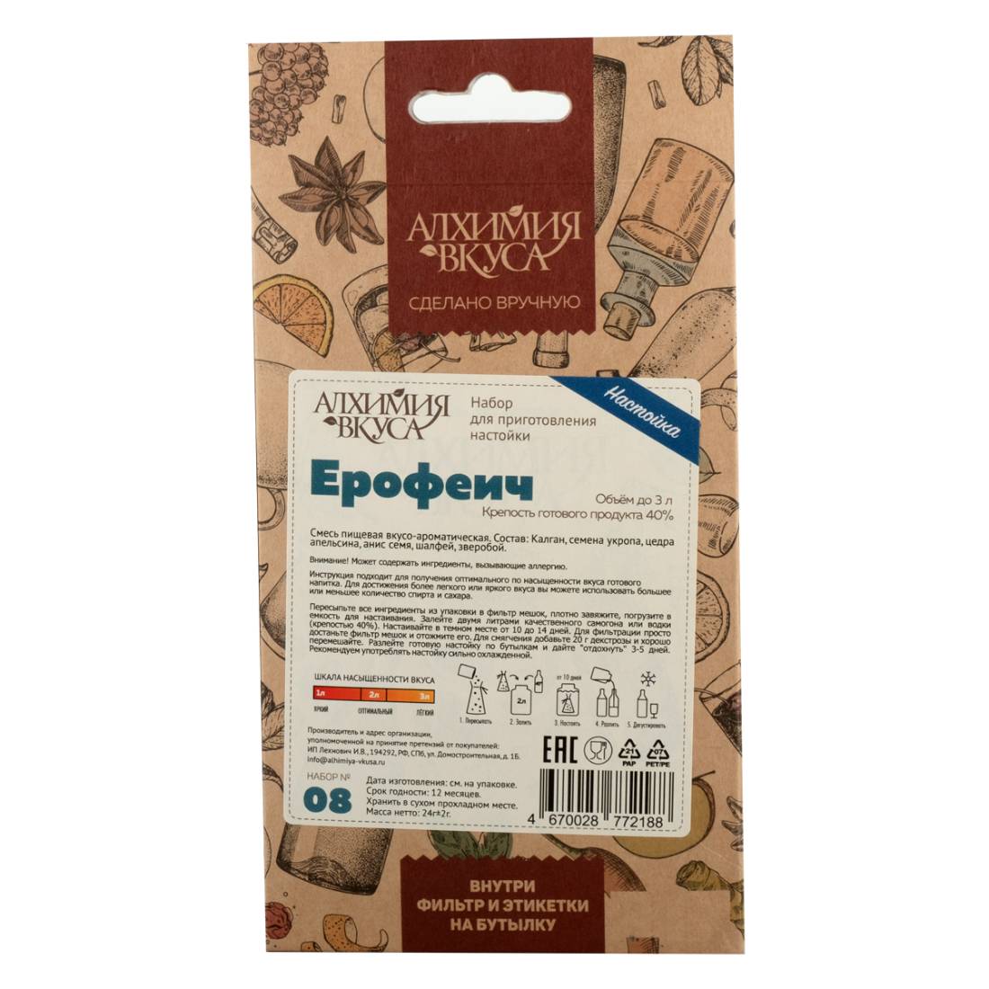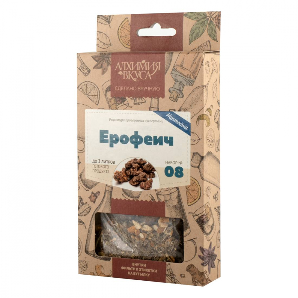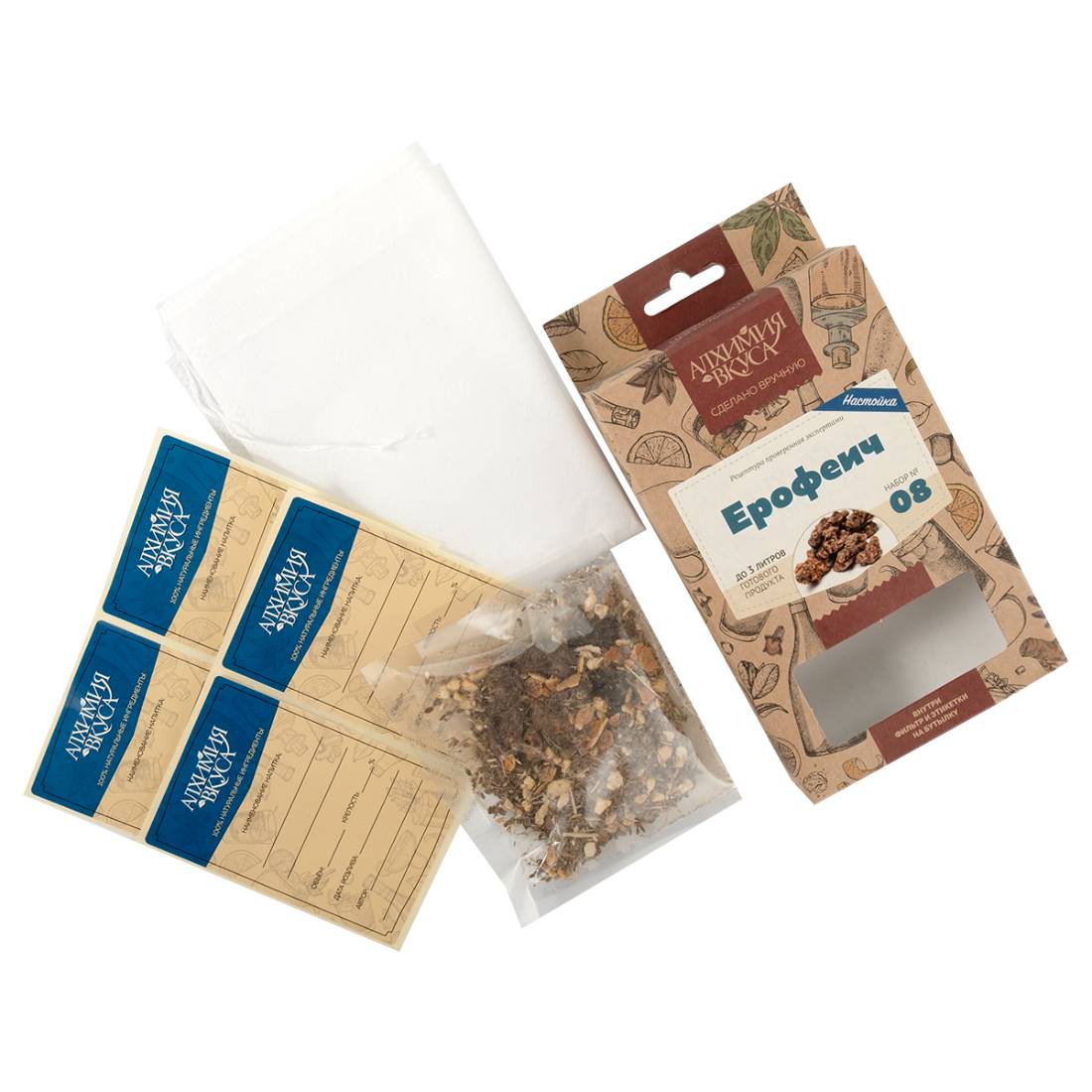 - В каждом наборе Алхимия вкуса находится специальный фильтр мешок, который позволяет не фильтровать готовый продукт после настаивания, а также этикетки для бутылок с готовым напитком.