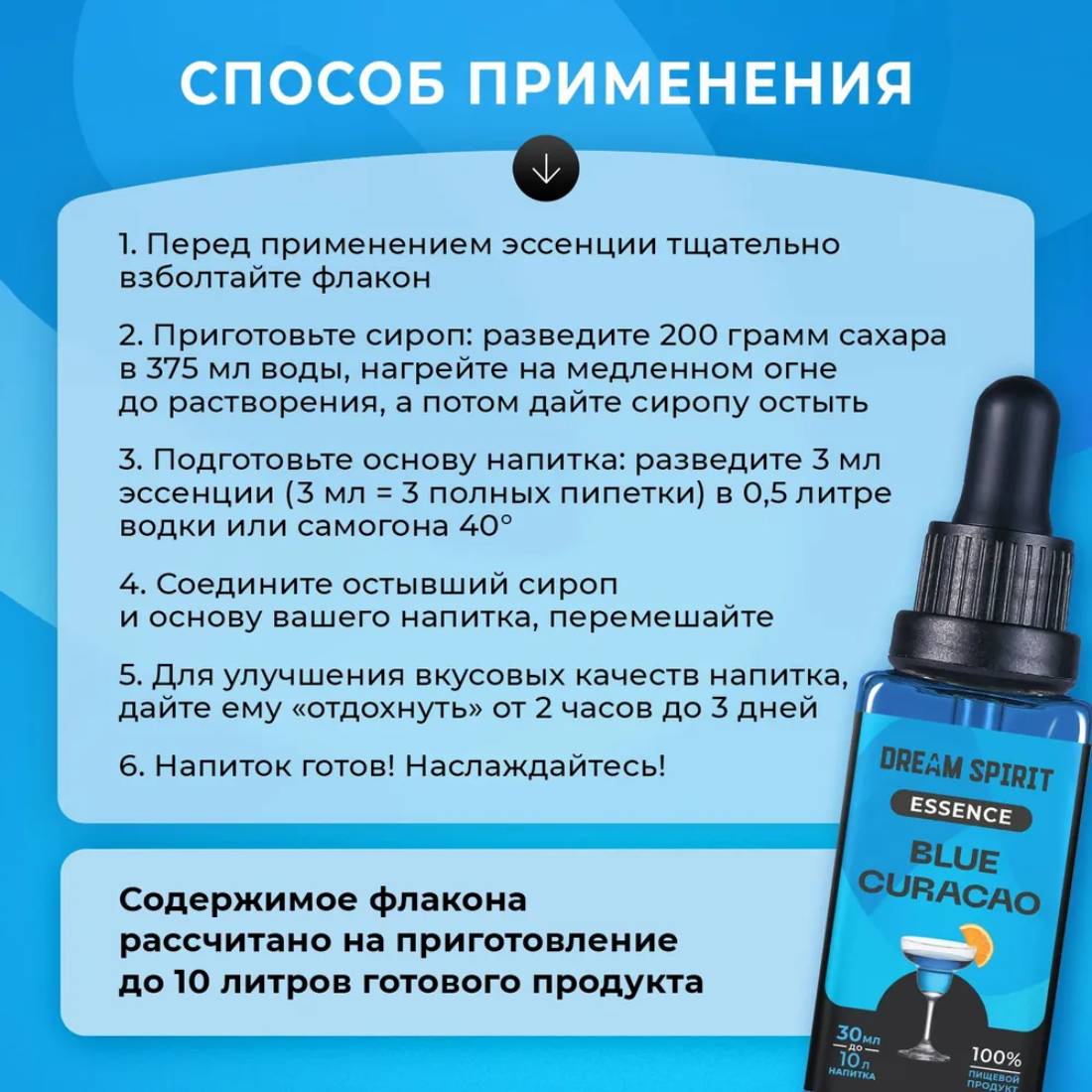 Эссенция Dream Spirit Блю Кюрасао\Blue Curacaoподходит как для опытных самогонщиков, так и для начинающих винокуров. Она применяется профессиональными барменами для создания ярких алкогольных и безалкогольных коктейлей, а также кондитерами для придания особого вкуса кремам, пропиткам тортов и пирожных.