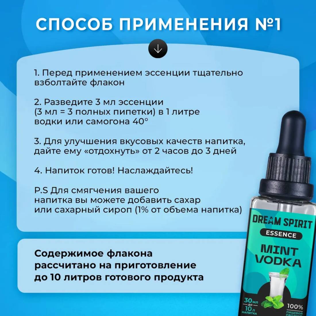 Эссенция Dream Spirit Мятная водка\Mint vodka станет прекрасным компаньоном для создания разнообразных коктейлей и кулинарных экспериментов. Подарите вашим коктейлям, десертам и выпечке неповторимые мятные нотки, чтобы удивить ваших гостей и близких оригинальными вкусовыми сочетаниями.