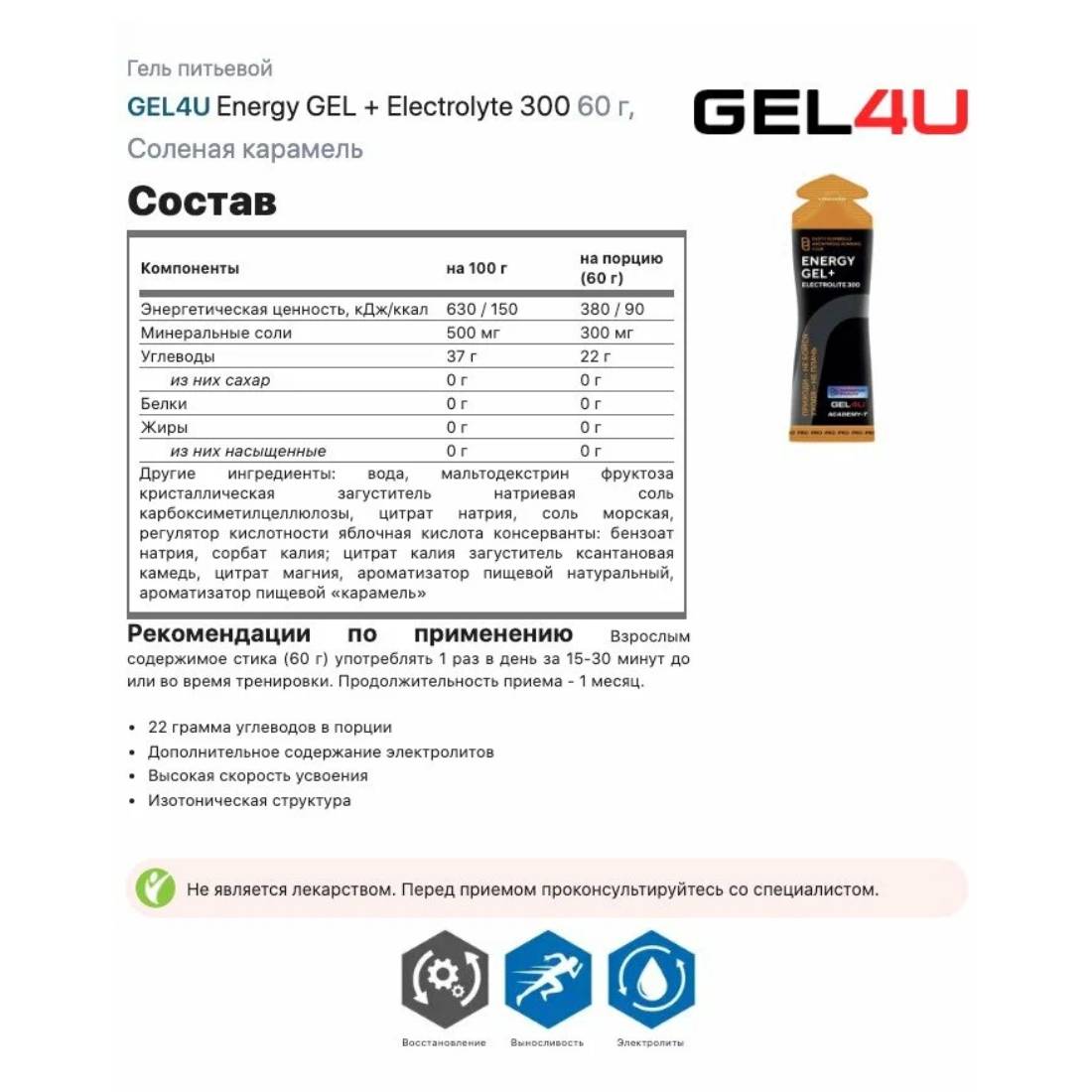 Углеводный гель GEL4U обладает текучей консистенцией и мягким вкусом без излишней приторности. Благодаря структуре близкой к изотонической , GEL4U с электролитами не требуют дополнительного приема жидкости для усвоения питательных веществ.