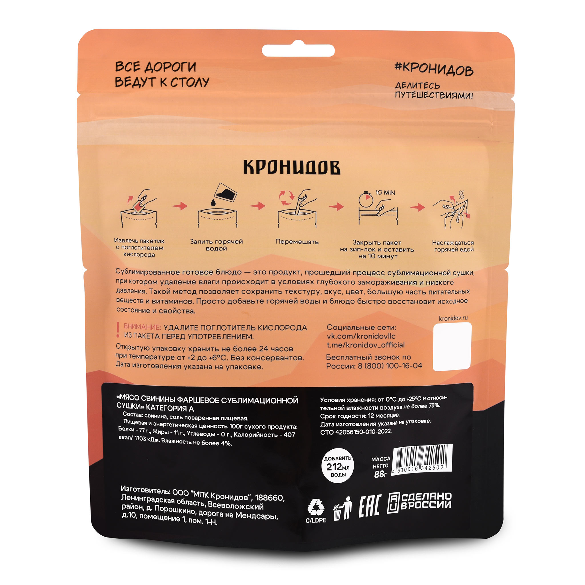 Сублимированное мясо свинины фаршевое от известного бренда "Кронидов", 88 гр – вкуснейшее, ароматное мясо.