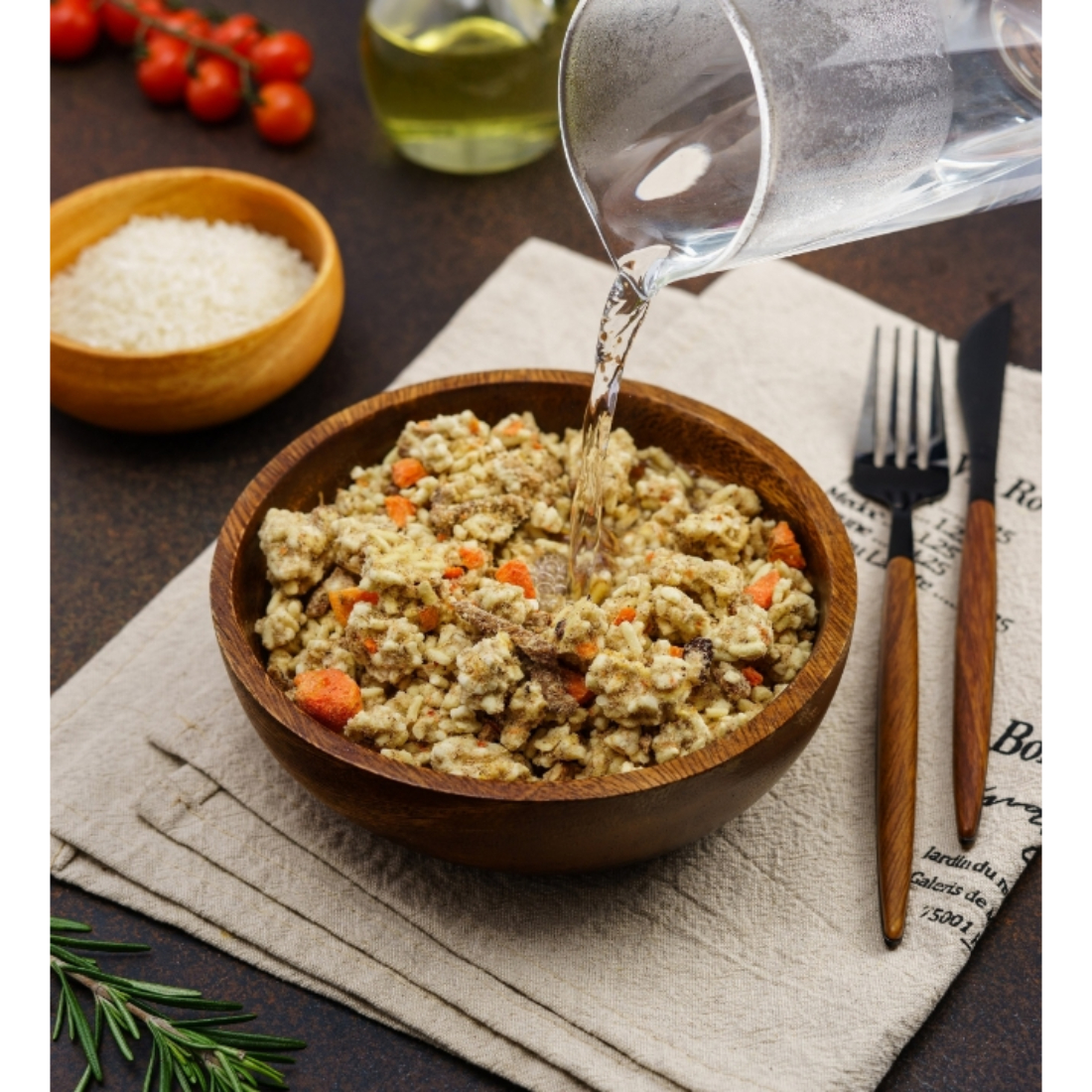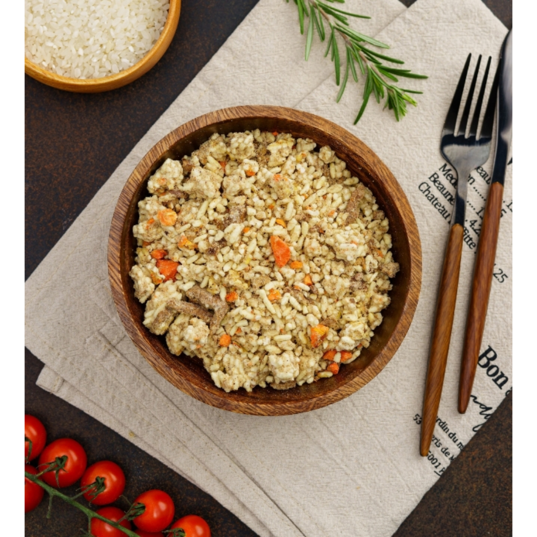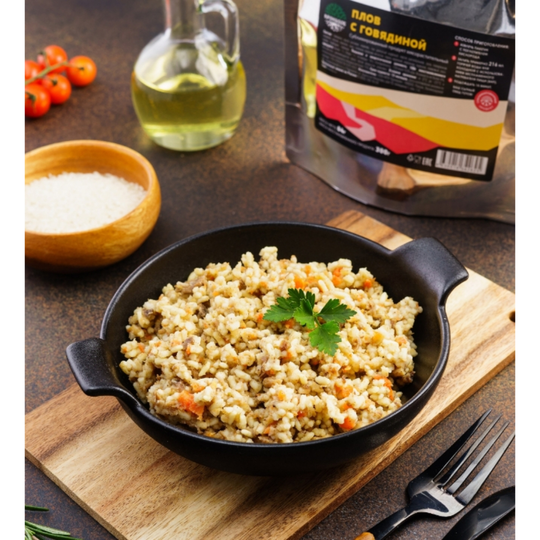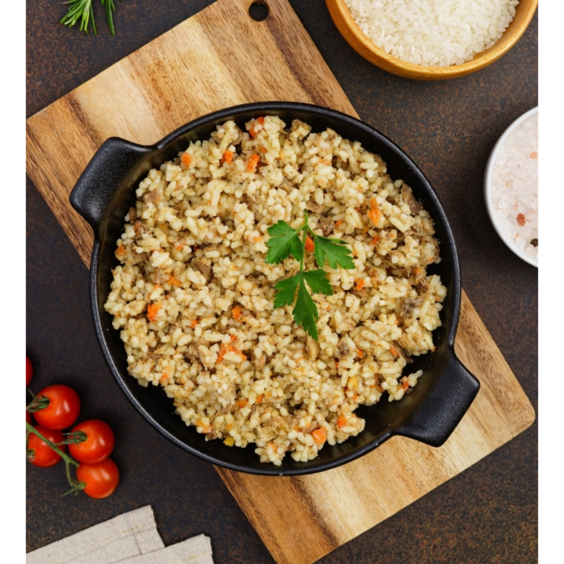 Состав: говядина, крупа рисовая, морковь, лук репчатый жареный, масло растительное, соль поваренная пищевая, чеснок, куркума, зира, паприка красная молотая, перец красный, кориандр, куркума, лавровый лист, кумин, барбарис, майоран.