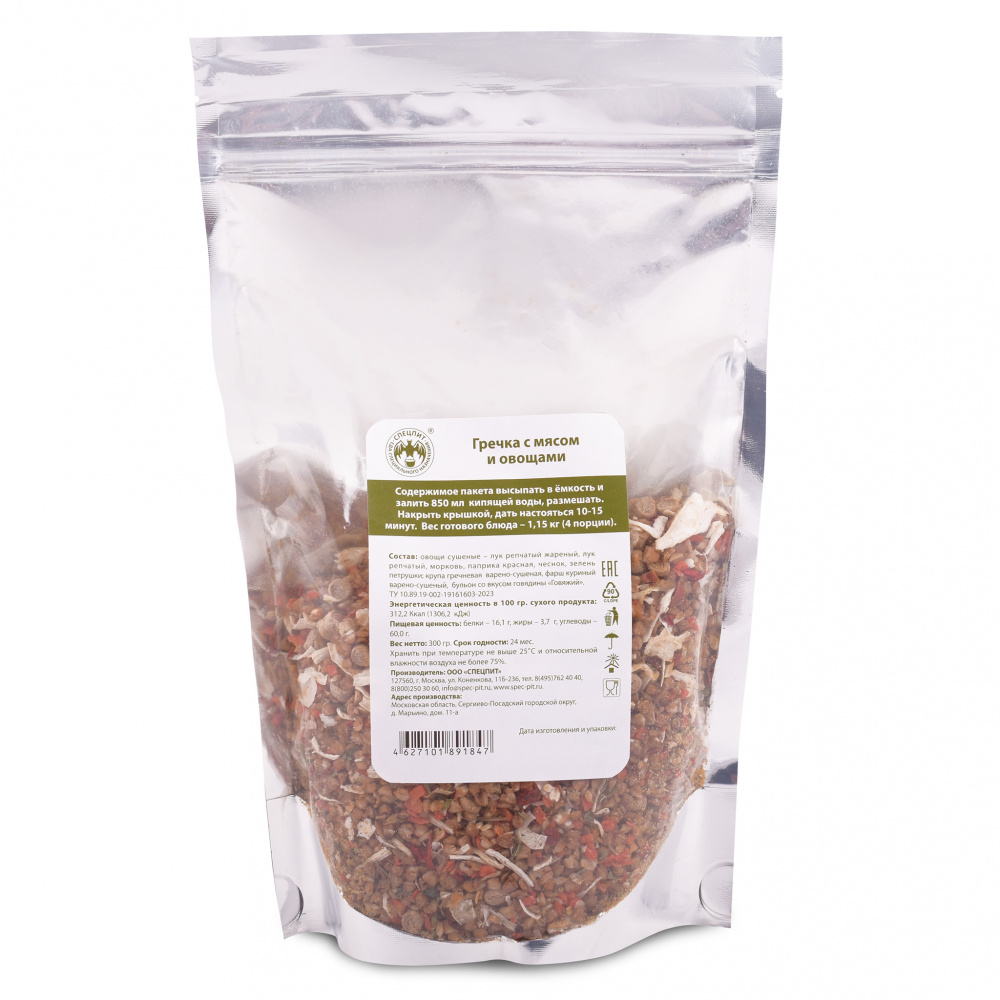 Состав: овощи сушеные - лук репчатый жареный, лук репчатый, морковь, паприка красная, чеснок, зелень петрушки, крупа гречневая варено-сушеная, фарш куриный варено-сушеный, бульон со вкусом говядины "Говяжий".