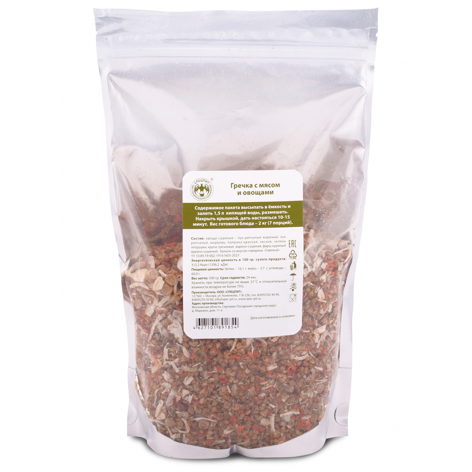 Состав: овощи сушеные - лук репчатый жареный, лук репчатый, морковь, паприка красная, чеснок, зелень петрушки, крупа гречневая варено-сушеная, фарш куриный варено-сушеный, бульон со вкусом говядины "Говяжий".