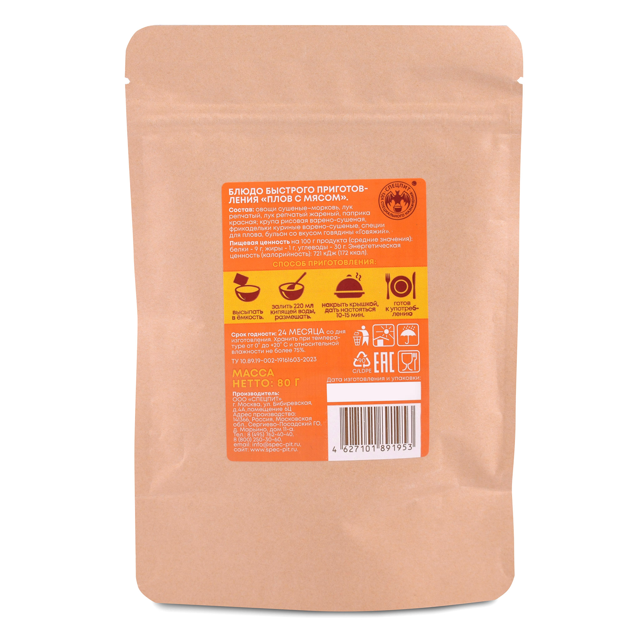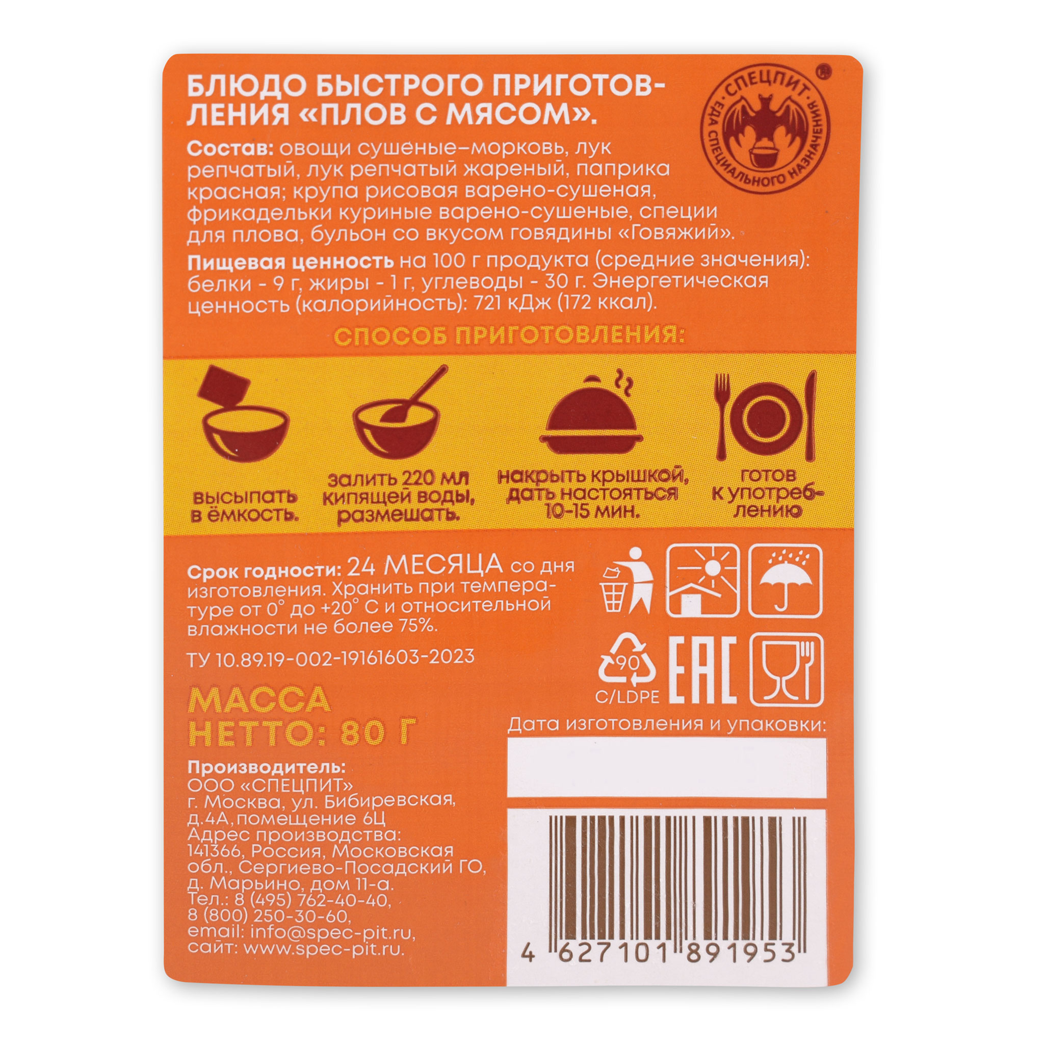 Состав: овощи сушеные – морковь, лук репчатый, лук репчатый жареный, паприка красная; крупа рисовая варено-сушеная, фрикадельки куриные варено-сушеные, специи для плова, бульон со вкусом говядины «Говяжий».