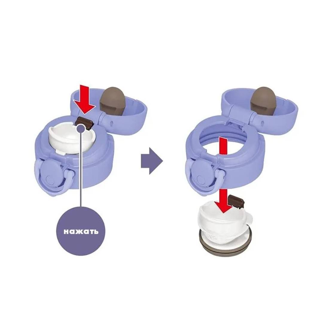 - Термос открывается одной рукой (левой или правой): при нажатии на кнопку верхняя крышка автоматические откидывается на 180 градусов, фиксируется в открытом положении и не опрокидывается при питье.