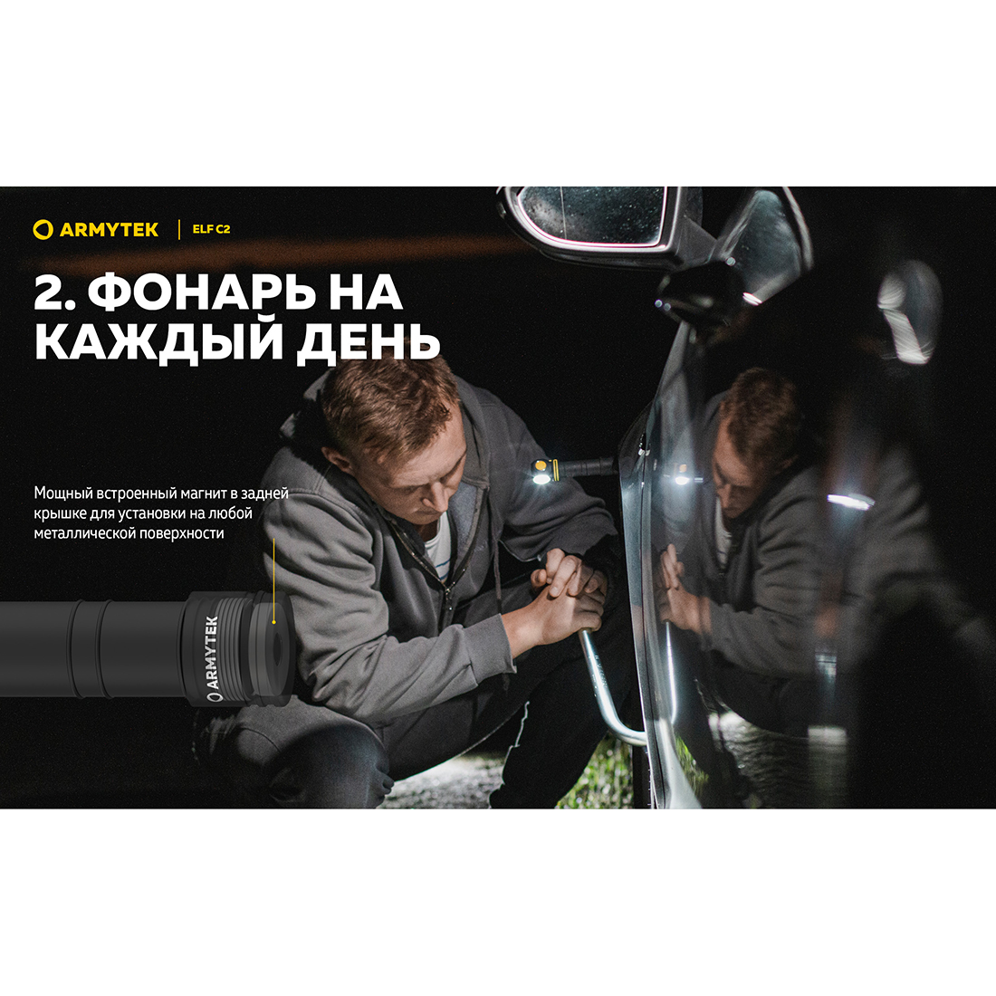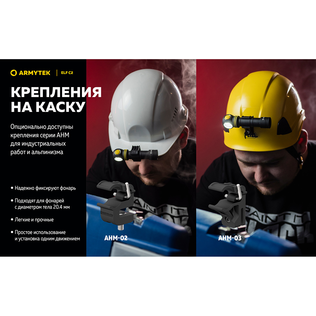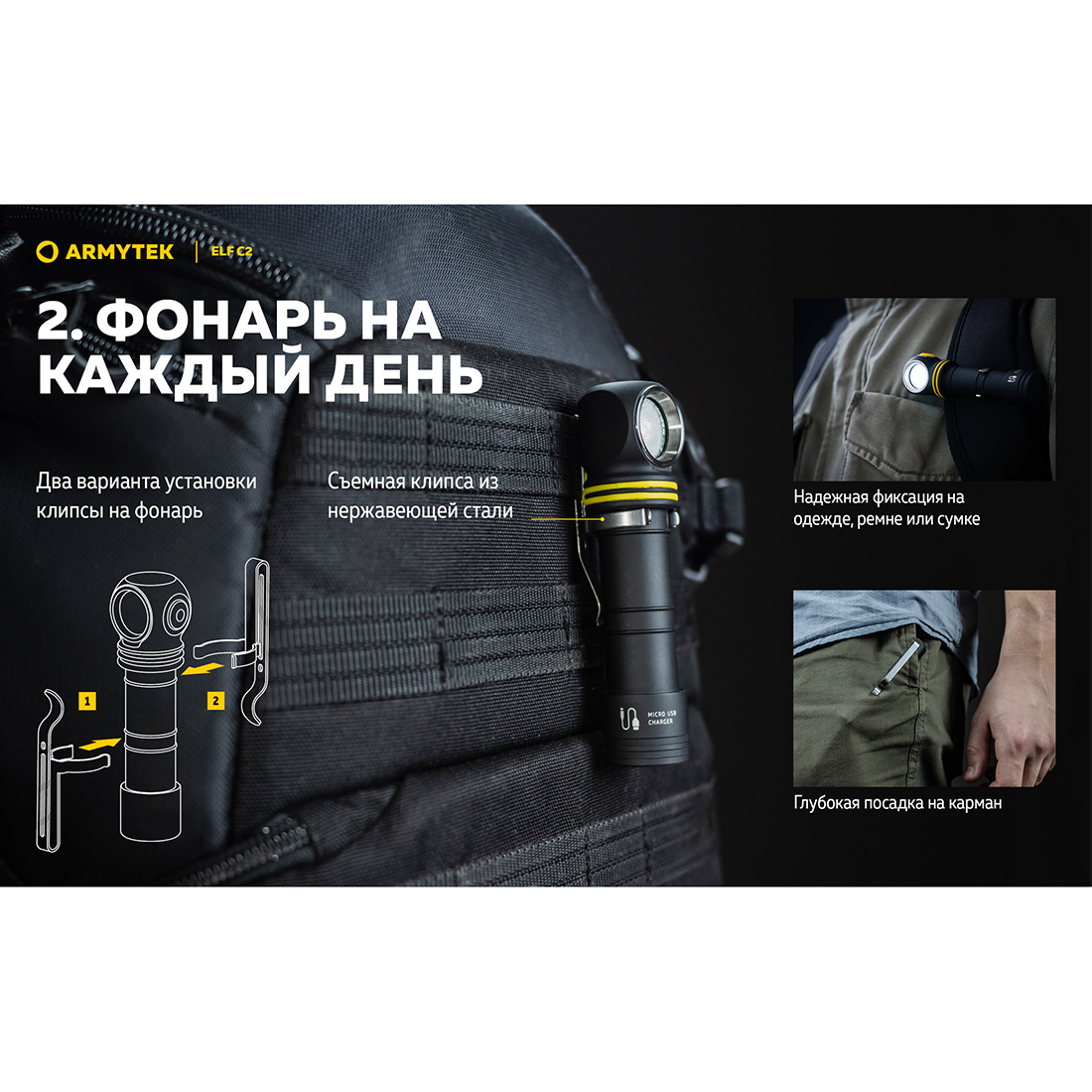 Благодаря встроенному магниту, а также стальной клипсе и налобному креплению в комплекте, фонарь можно фиксировать на голове, одежде или на металлических поверхностях. Elf C2 также совместим с опциональными аксессуарами: с велокреплением ABM-01 для велопрогулок и с креплениями на каску серии AHM для индустриальных работ и альпинизма.