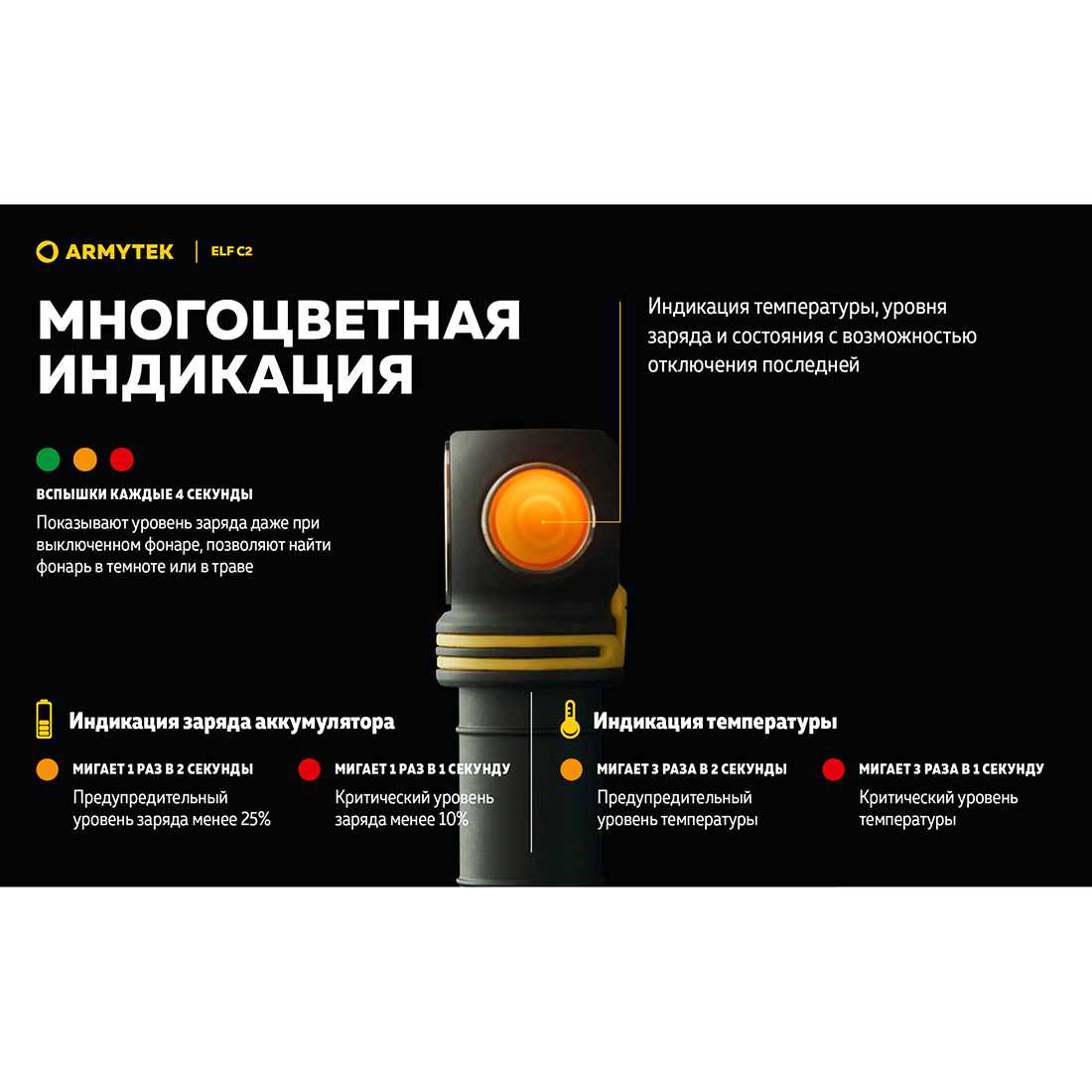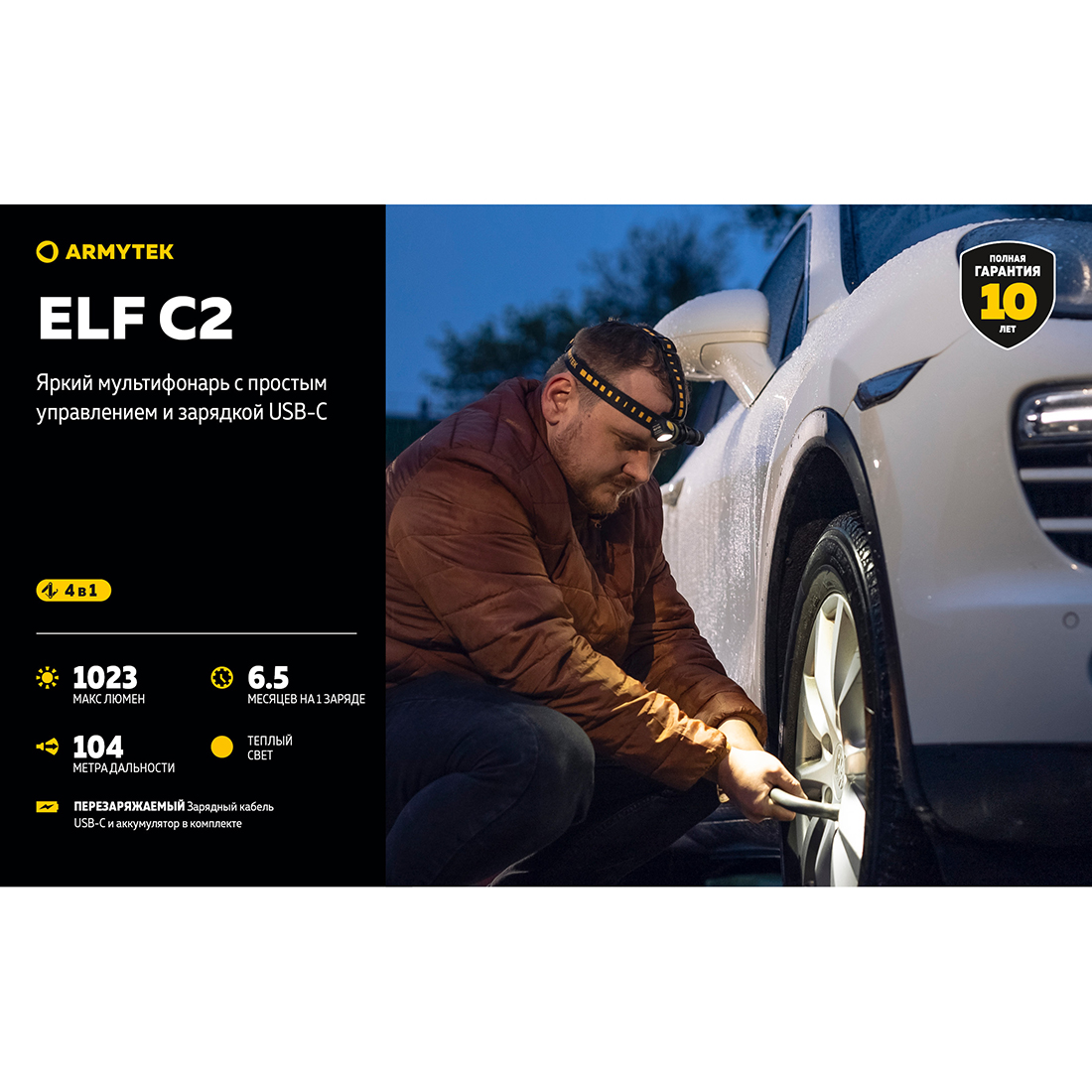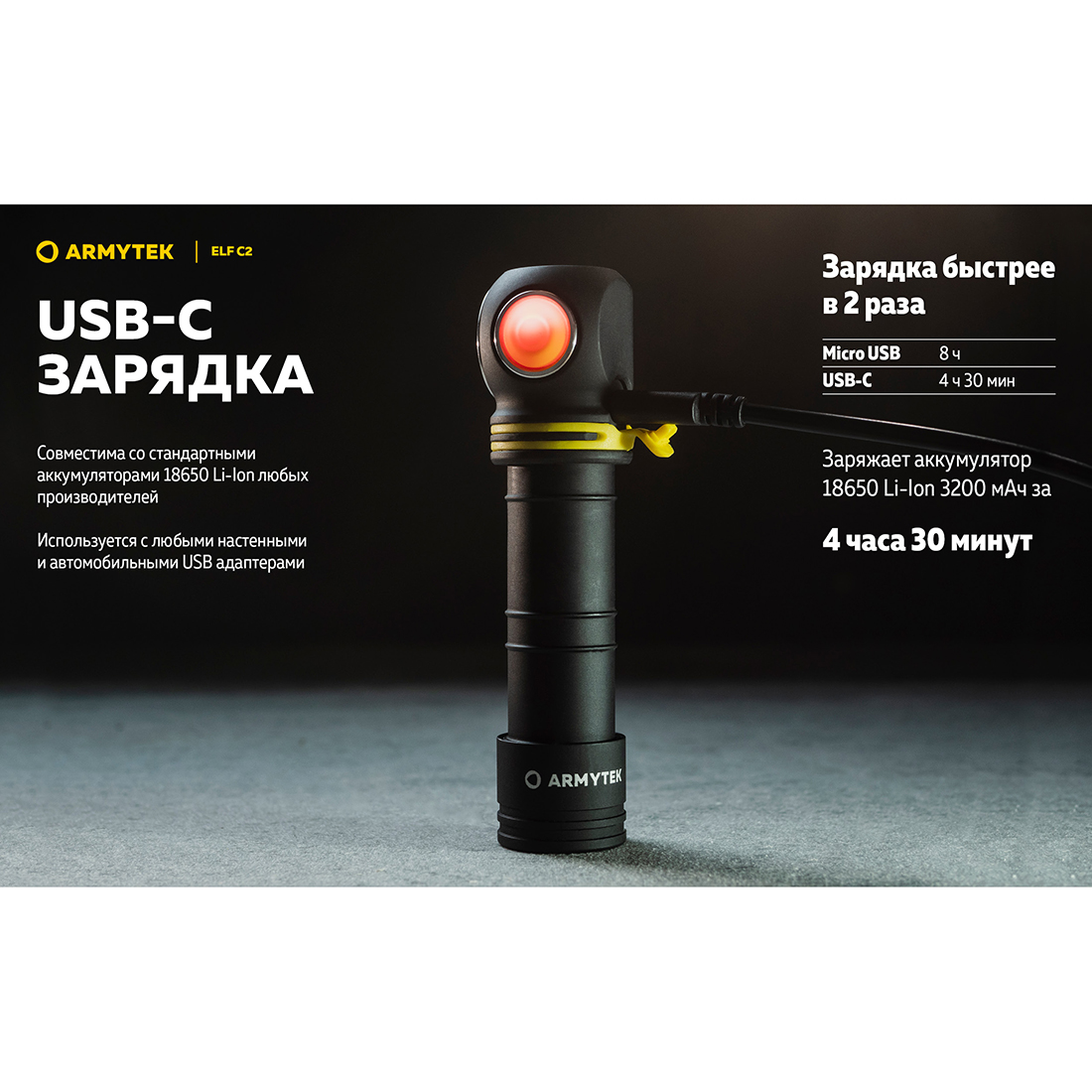 Многофункциональная модель с яркостью до 1100 люмен и дальностью до 105 метров подходит для отдыха за городом, занятий спортом, ремонта и профессиональной деятельности. Elf C2 работает рекордные 6.5 месяцев в минимальном режиме и неограниченное время как фонарь-лампа — без аккумулятора, напрямую от любого источника питания с выходом USB. Универсальный зарядный слот избавляет пользователя от необходимости постоянно носить с собой специальное зарядное устройство: для зарядки подойдет стандартный USB-C кабель любого производителя.