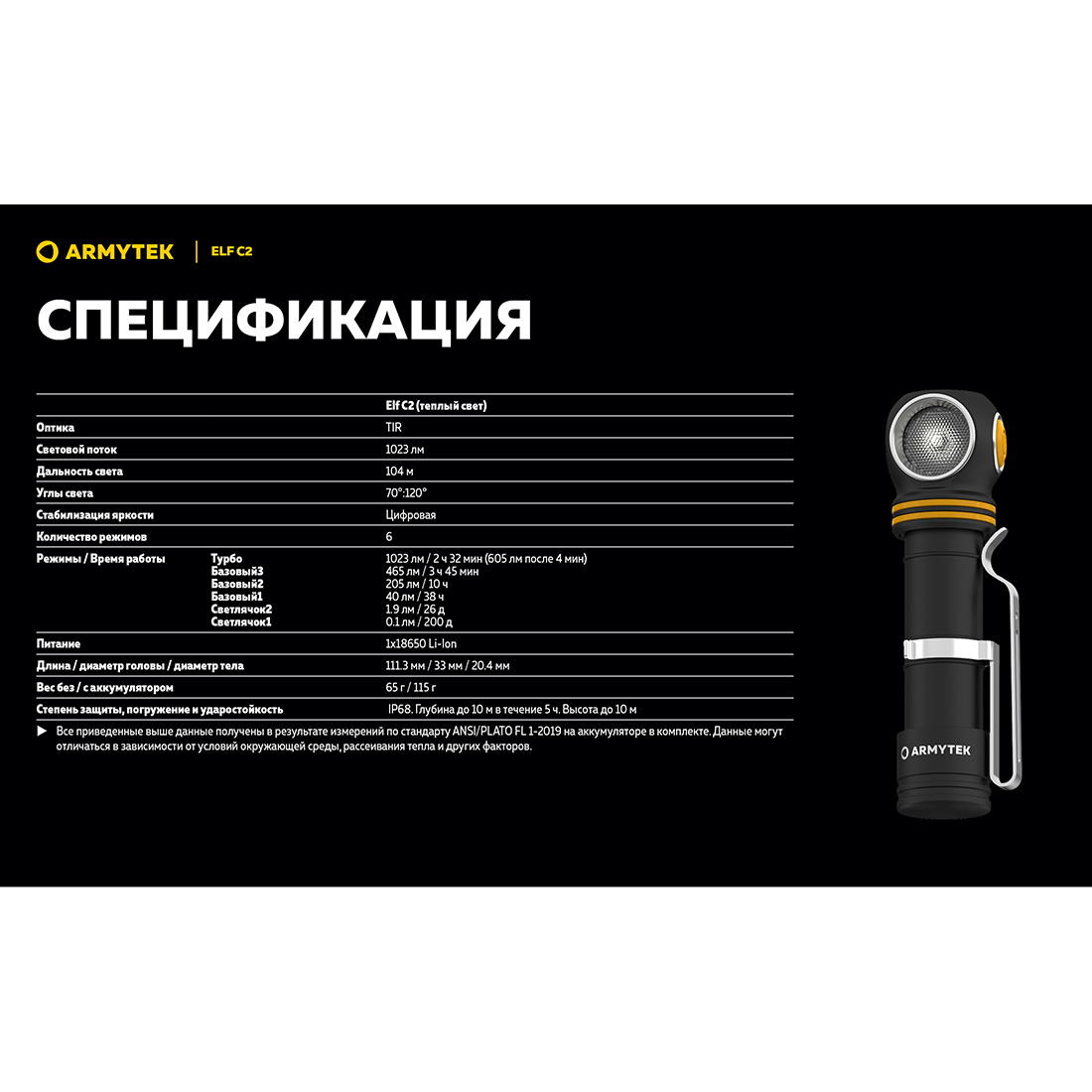- Время работы в максимальном режиме: 2 ч 32 мин (605 лм после 4 мин)