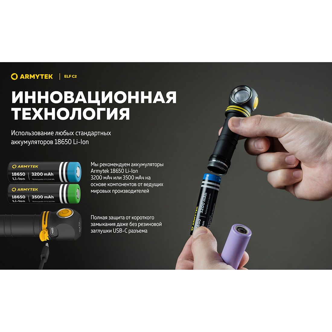 - Совместимость с элементами питания: 1x18650 Li-Ion