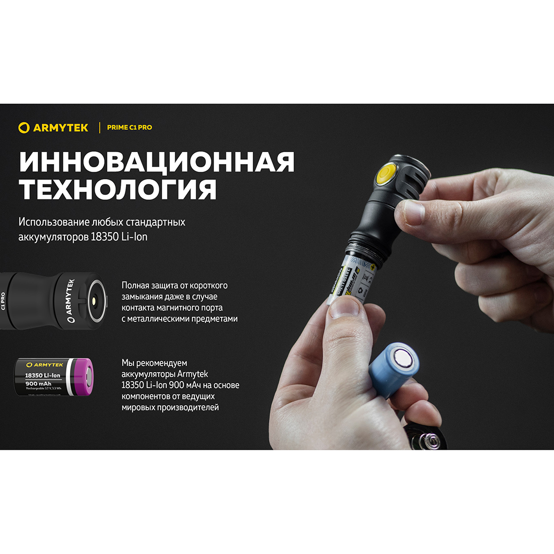 - Инновационная технология позволяет использовать любые стандартные аккумуляторы 18350 Li-Ion. Полная защита от короткого замыкания даже в случае контакта магнитного порта с металлическими предметами.