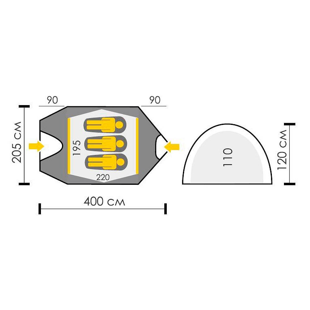 Один из входов имеет два варианта открытия и фиксации в открытом положении. В тамбурах можно разместить большое количество снаряжения, а так же приготовить пищу на горелке, во время непогоды.