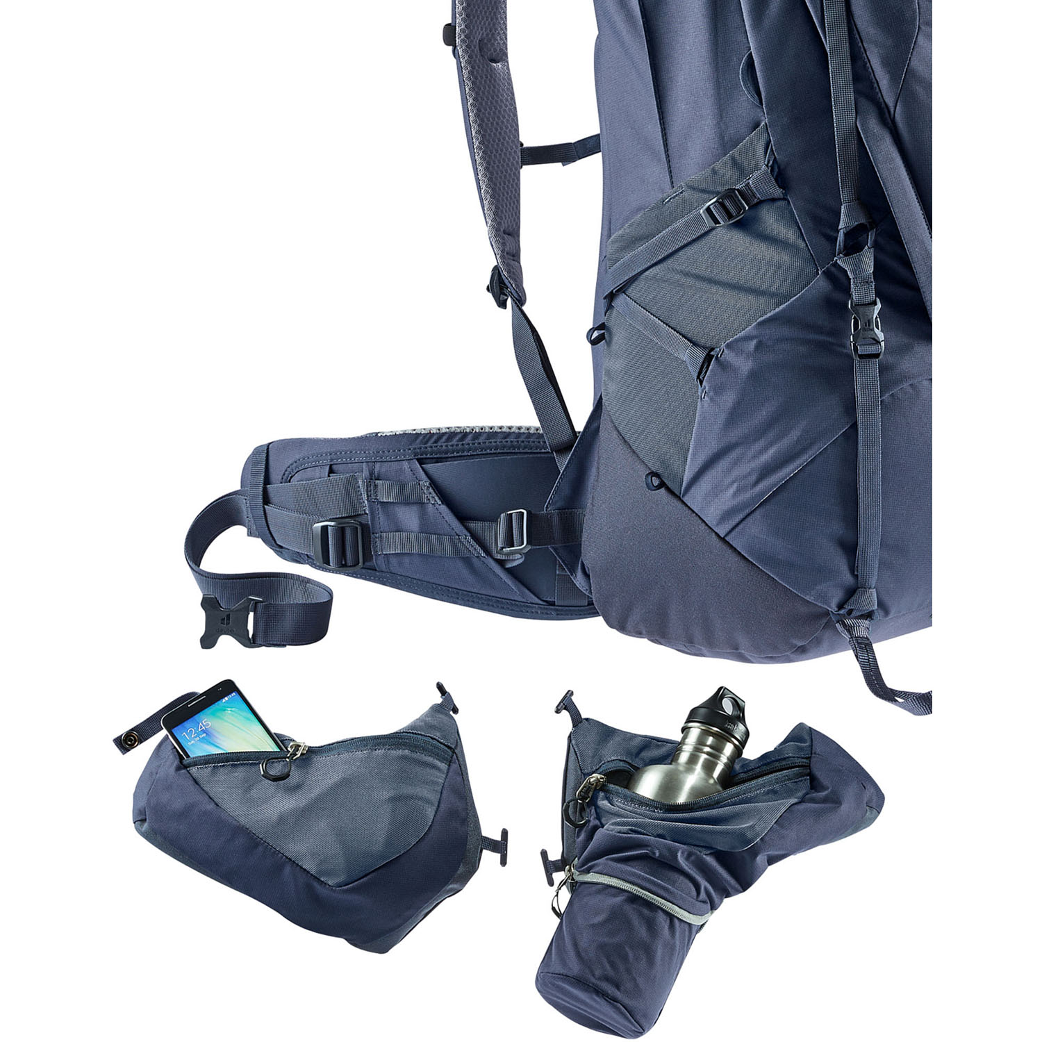 - Два вместительных съемных кармана на молнии на поясном ремне (3 л) для дополнительных вещей. В правом кармане есть холстер на молнии для 1,5-литровых бутылок.