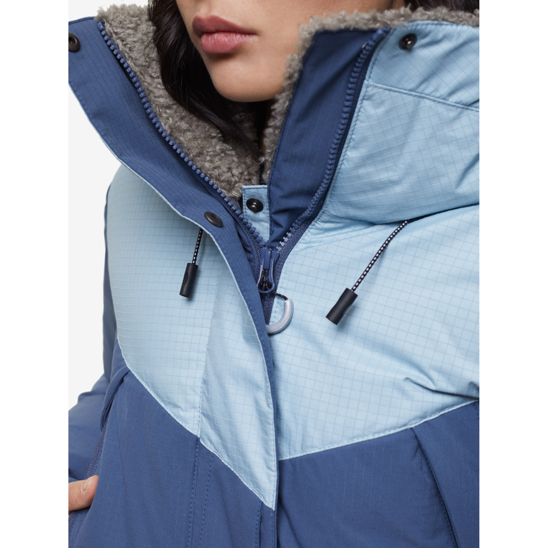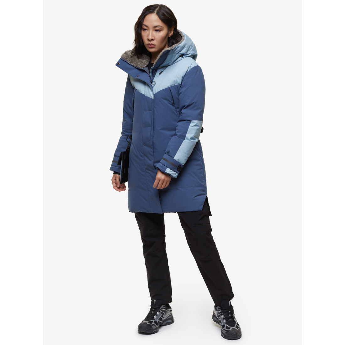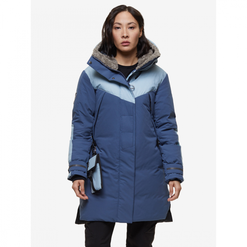 - объемный теплый капюшон с системой регулировок и ветрозащитным тубусом, усиленным проволокой