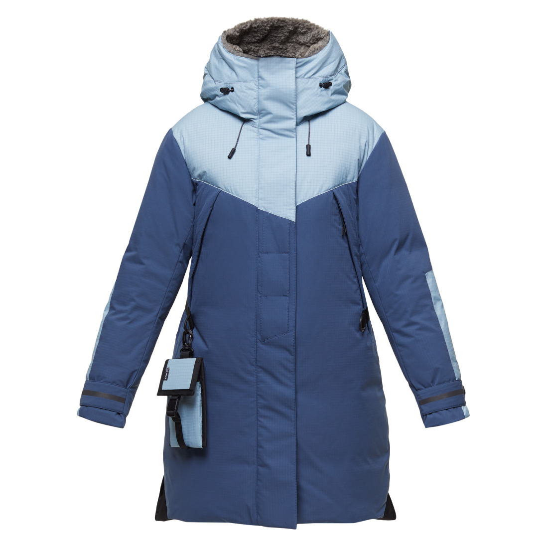 - чехол для электронных устройств из светоотражающего материала может храниться в объемном кармане под ветрозащитной планкой, крепиться к полукольцам или шлевке на центральной планке