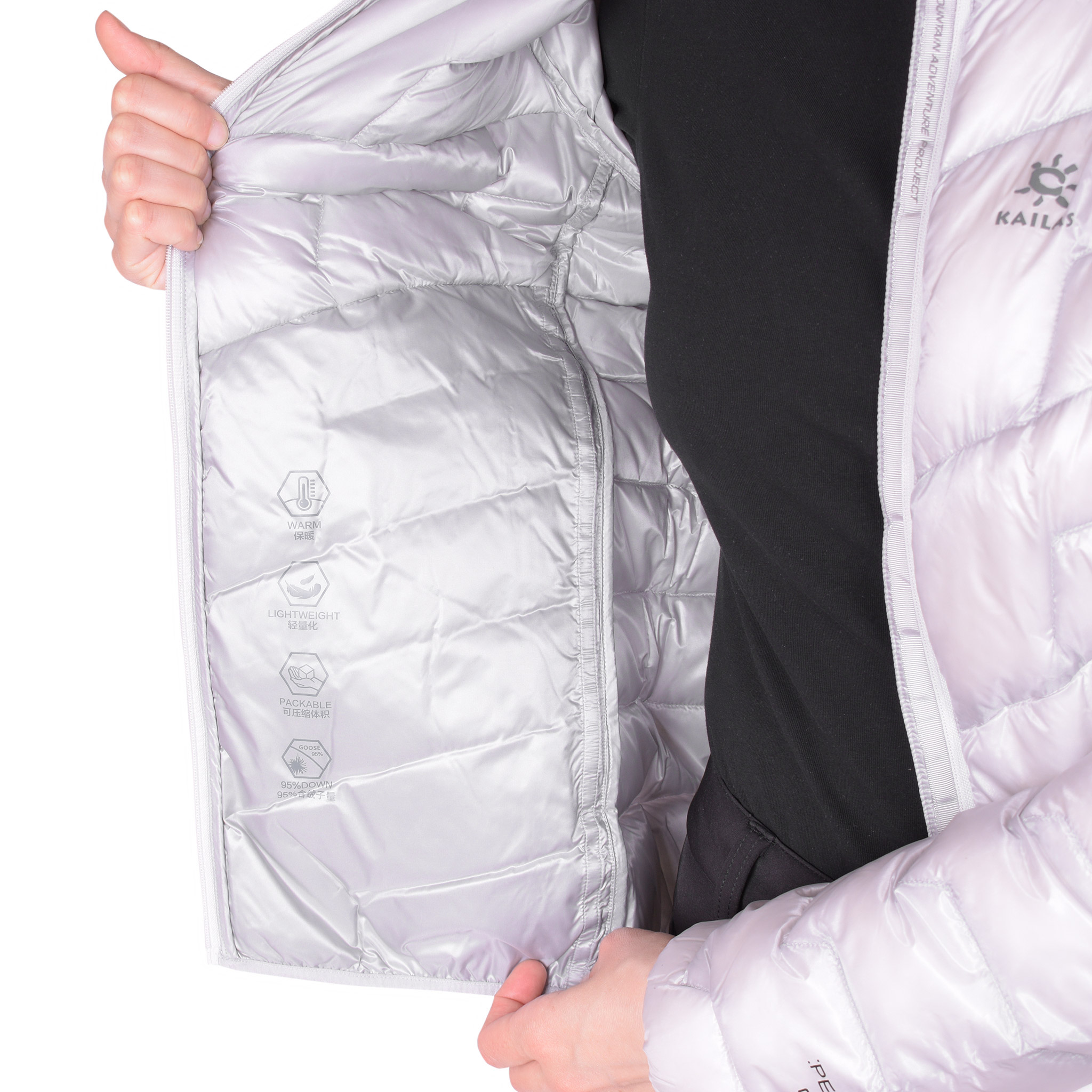 - Современный наполнитель гусиный пух 900FP с водоотталкивающей обработкой, чтобы сохранять свои свойства во влажных условиях.